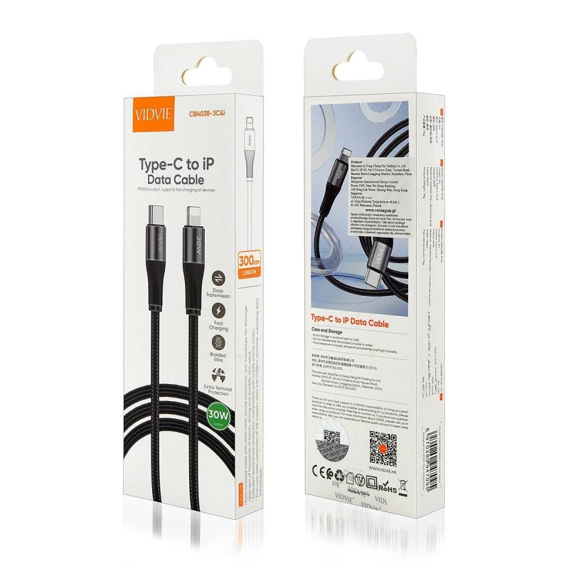 Kabel TYP-C - iPhone Lightning 3m Vidvie CB4038 czarny 30WKabel TYP-C - iPhone Lightning 3m Vidvie CB4038 czarny 30W